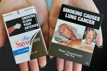 タバコによる健康被害を示す悲惨な画像を全面に押し出し、警告文ものせて、ブランド名をのせる部分は小さくなっています。(by わかるニュース)